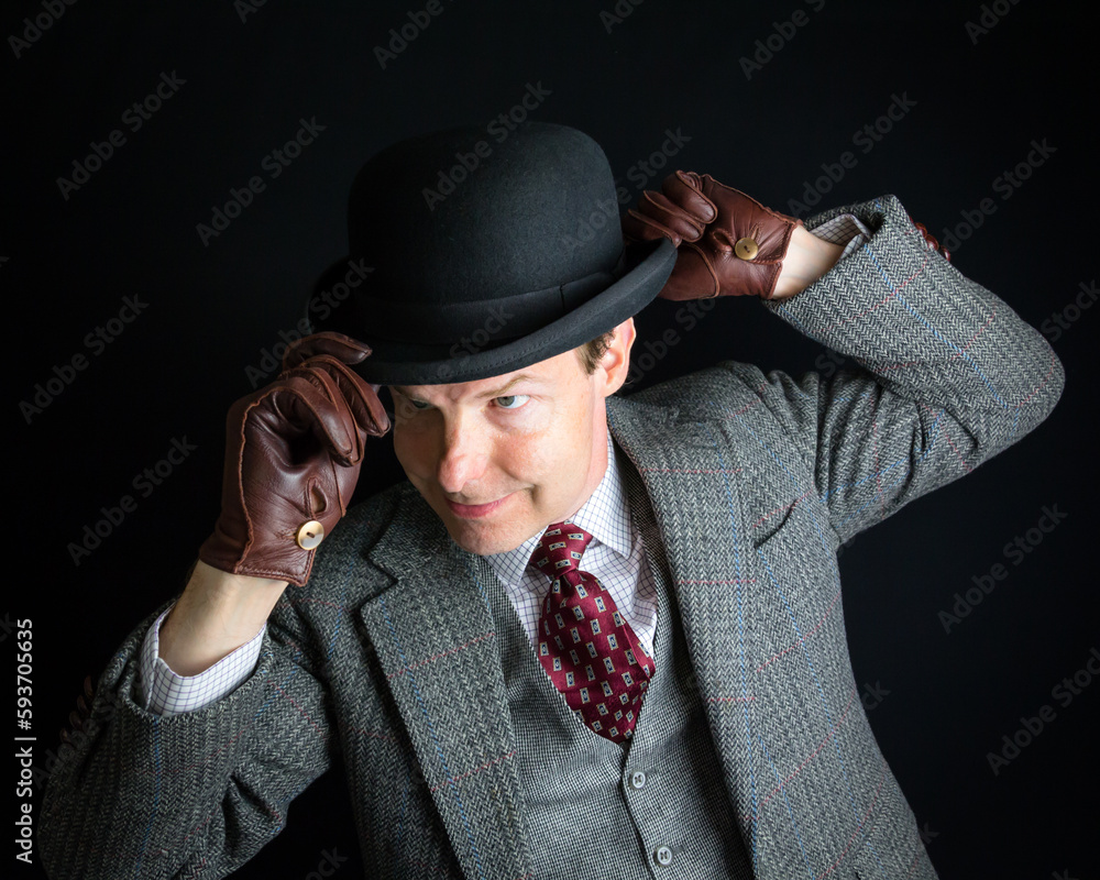 Portrait of Man in Tweed Suit Holding Bowler Hat on Black Very well made.
