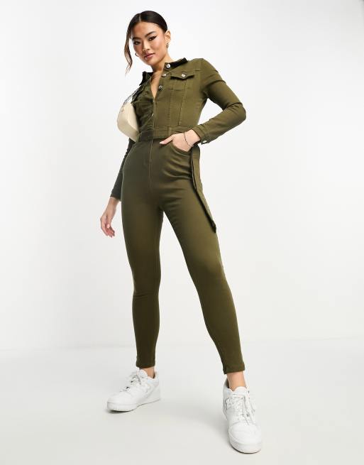 Parisian long sleeve tie waist denim jumpsuit in khaki ASOS Very well made.