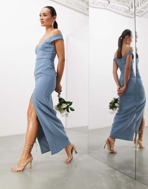 ASOS DESIGN Bridesmaid crepe bardot column maxi dress with split in dusky blue Very well made.
